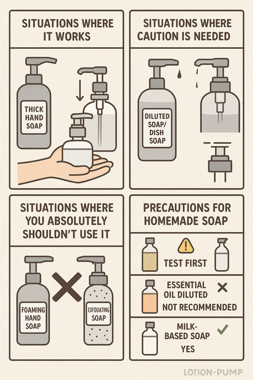 | Tipo de jabón | ¿Funciona en bomba de loción? | Pasos clave |