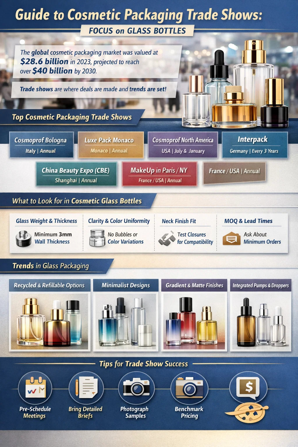 Si busca envases para productos cosméticos, especialmente materiales de primera calidad como botellas de vidrio cosméticas — asistir a las ferias comerciales adecuadas es una de las decisiones más eficientes que puede tomar. En un solo lugar, puede comparar cientos de proveedores, manejar muestras físicas, negociar precios directamente y construir relaciones que tardan meses en replicarse a través del correo electrónico. El mercado mundial de envases cosméticos estaba valorado en aproximadamente 28.600 millones de dólares en 2023 y se prevé que alcance más de 40 mil millones de dólares para 2030, según Grand View Research. Las ferias comerciales son el lugar donde se da forma a una parte importante de este mercado: se cierran acuerdos, se establecen tendencias y se construyen redes de proveedores.