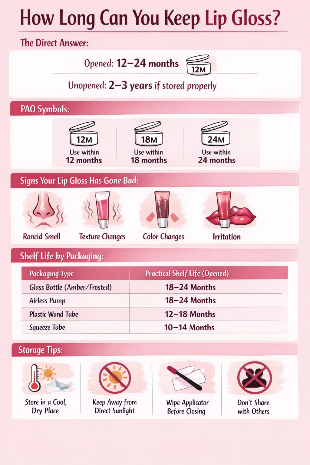 La mayoría de los brillos de labios duran entre 12 y 24 meses después de la apertura , y hasta 2 a 3 años si se deja sin abrir y se almacena adecuadamente. En el momento en que destapas el tubo o la varilla y expones la fórmula al aire, la luz y las bacterias, el tiempo comienza a correr. Algunas glosas llevan un símbolo PAO (Período después de la apertura), un pequeño ícono de frasco abierto con un número como "12M" o "18M", impreso en el empaque. Ese número le indica exactamente cuántos meses el producto sigue siendo seguro y eficaz después del primer uso.