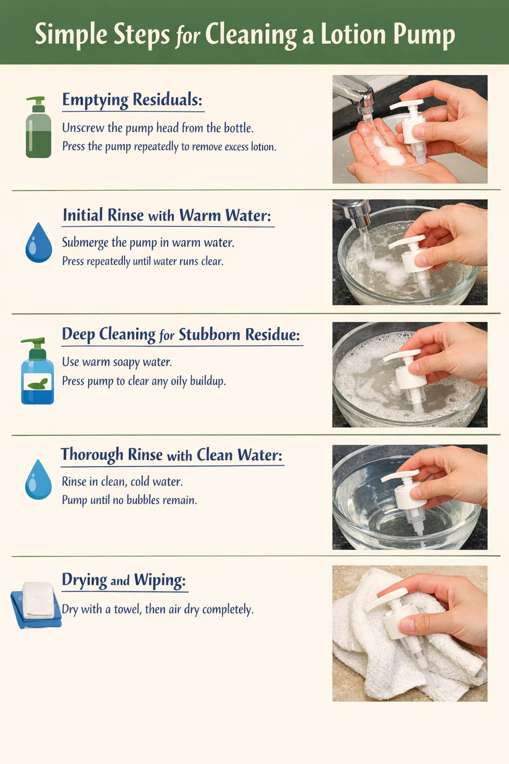 Limpiar una bomba de loción es bastante sencillo. Con el método correcto, puede eliminar fácilmente el producto residual, garantizando la limpieza y evitando obstrucciones para uso futuro.