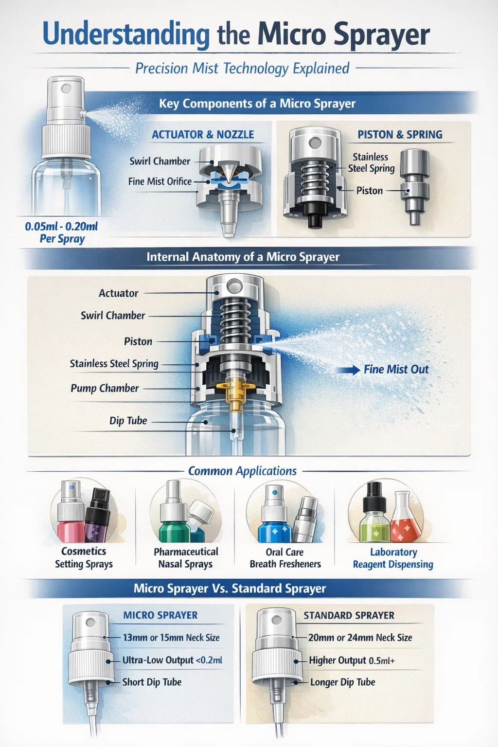 Para responder la pregunta "¿Qué es un micropulverizador?" , es un dispositivo dispensador de precisión diseñado para convertir el líquido en una niebla extremadamente fina y consistente con un volumen de salida muy bajo por golpe. un diferencia de los pulverizadores de gatillo estándar utilizados para la limpieza del hogar, un micro pulverizador normalmente se dispensa entre 0,05 ml y 0,20 ml de producto a la vez, lo que lo convierte en la opción ideal para líquidos de alto valor donde el control de la dosis y la aplicación delicada son primordiales.