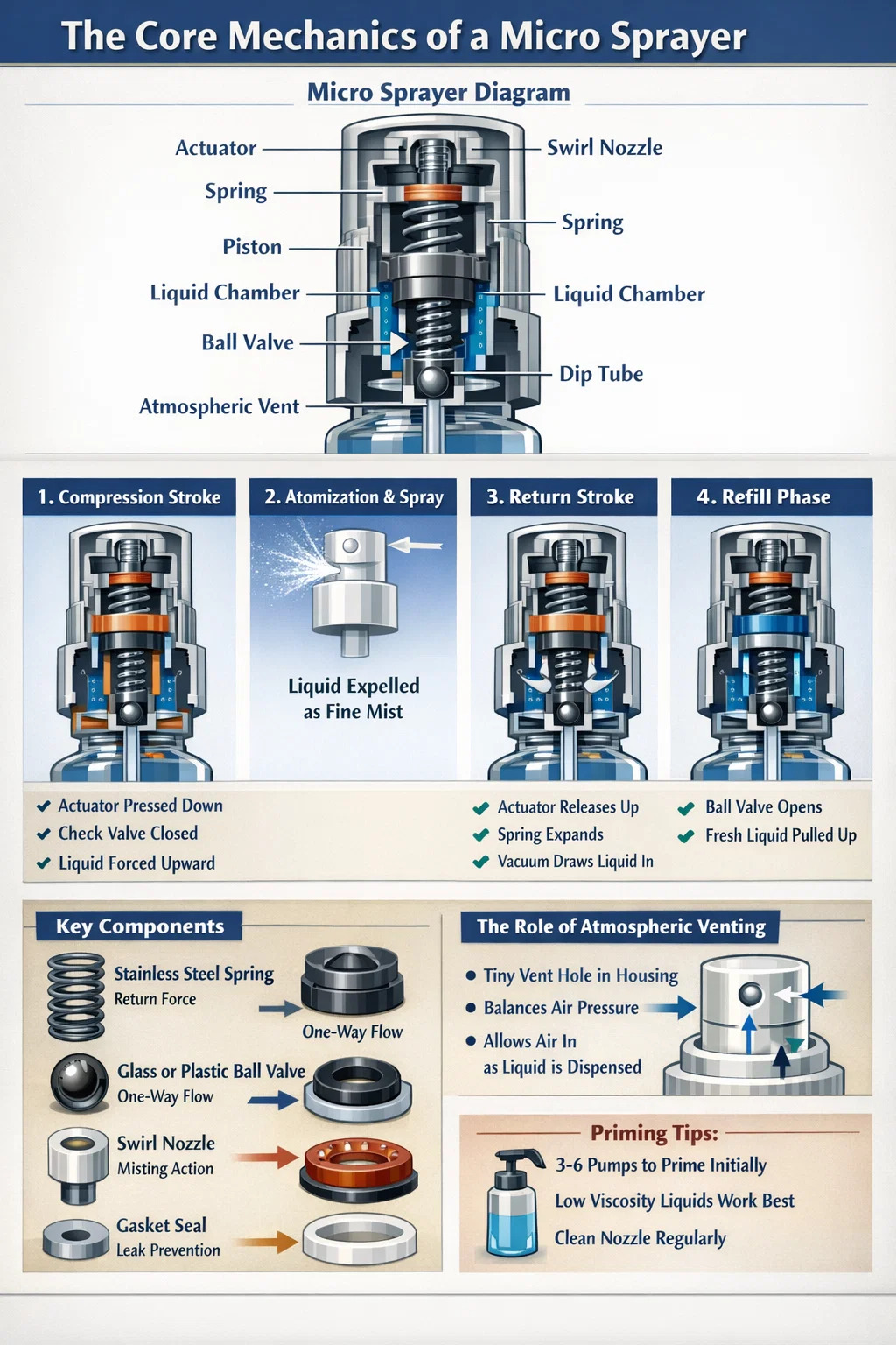 Una alta calidad micro pulverizador opera en un proceso cíclico de cuatro etapas que garantiza una salida constante de niebla fina, que generalmente varía desde 0,1 ml a 0,15 ml por pasada .